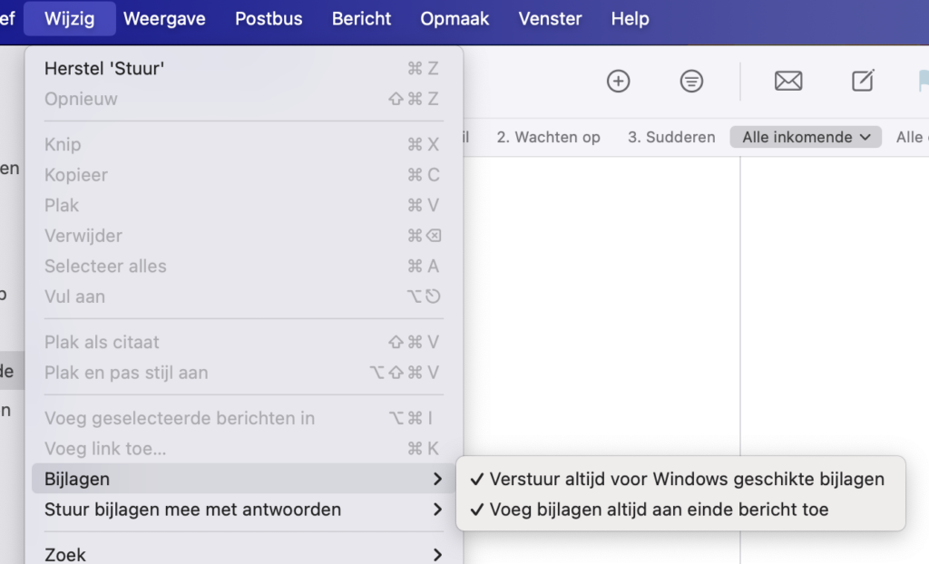 Ga in Mac Mail bovenin naar het Menu item Wijzig. Zoek naar naar Bijlagen en kies daarna voor Voeg altijd bijlagen altijd aan eind van bericht toe.