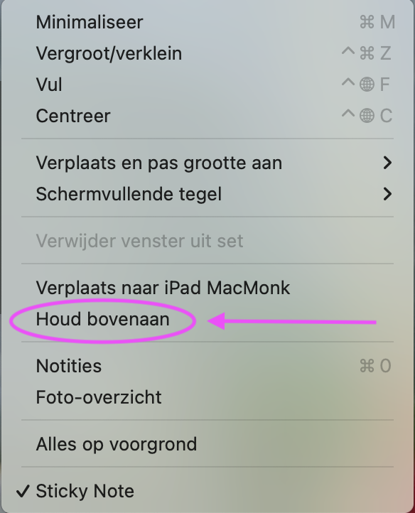 Ga in Notities naar het menu ‘Venster‘ en klik daar op ‘Houd bovenaan‘ (wat een beetje rare vertaling is van ‘Keep on top’ 😊