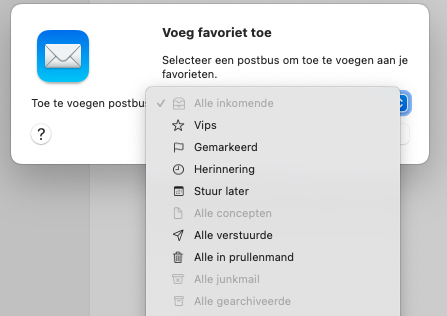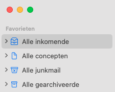 Om Mac Mail overzichtelijk te houden richten we Favorieten goed in. We willen vier mappen zichtbaar hebben in de Favorieten te weten: – Alle inkomende – Alleconcepten – Alle junkmail – Alle gearchiveerde