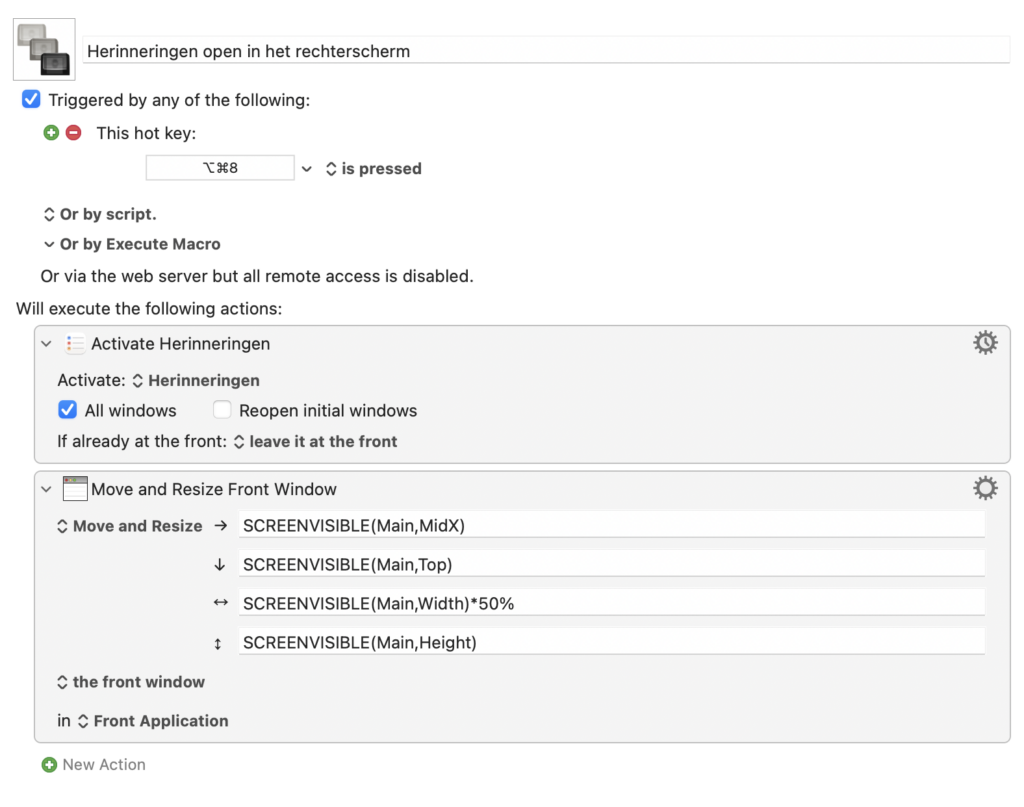 Dat kan op verschillende manieren. Ik zelf doe het met een macro in Keyboard Maestro. De macro activeert Herinneringen en plaats deze op de rechterhelft van mijn scherm. Voor de liefhebber: de macro ziet er zo uit: