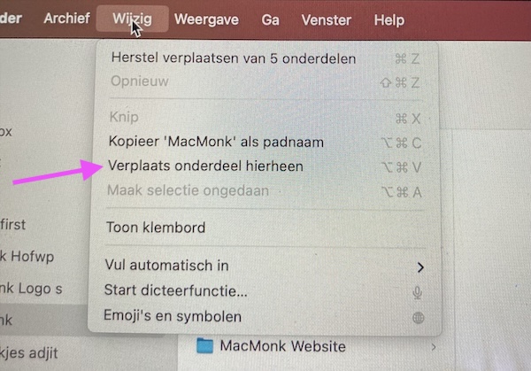 Je ziet achter de keuze Verplaats onderdeel hierheen de sneltoets ⌥ ⌘ V staan. Deze toetscombinatie verplaatst je gekopieerde bestand(en) direct naar de gewenste plek en wist ze op de oorspronkelijke plek.