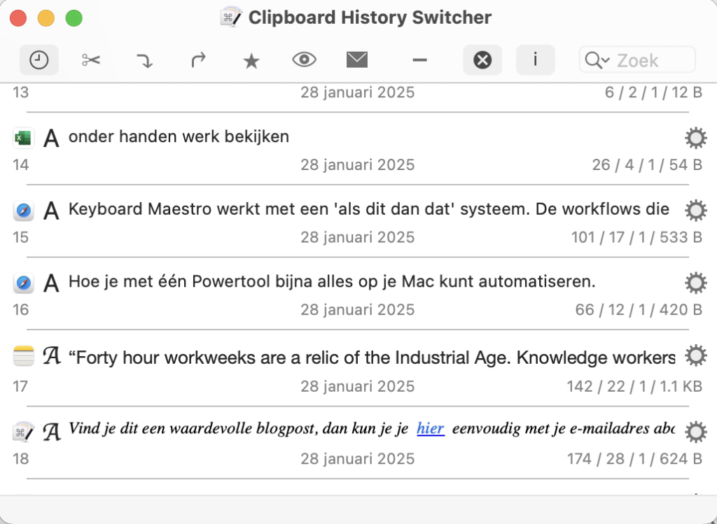 Hoe onhandig dat je niet standaard een geschiedenis hebt van de teksten die je gekopieerd of geknipt hebt. Gelukkig is dat opgelost met Keyboard Maestro. Met één toetscombinatie heb je een overzicht over alles wat je hebt gekopieerd of geknipt. Super handig en een omissie dat de Mac dat zelf niet heeft. Clipboardhistory is een standaard Makro. Klik hier voor meer uitleg.