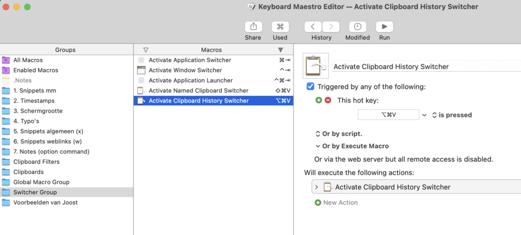 De betreffende makro staat standaard in een macrogroep (aka ‘map’) die ‘Switcher group’ heet, en de macro zelf heet ‘Activate Clipboard History Switcher’. Dat ziet er zo uit.